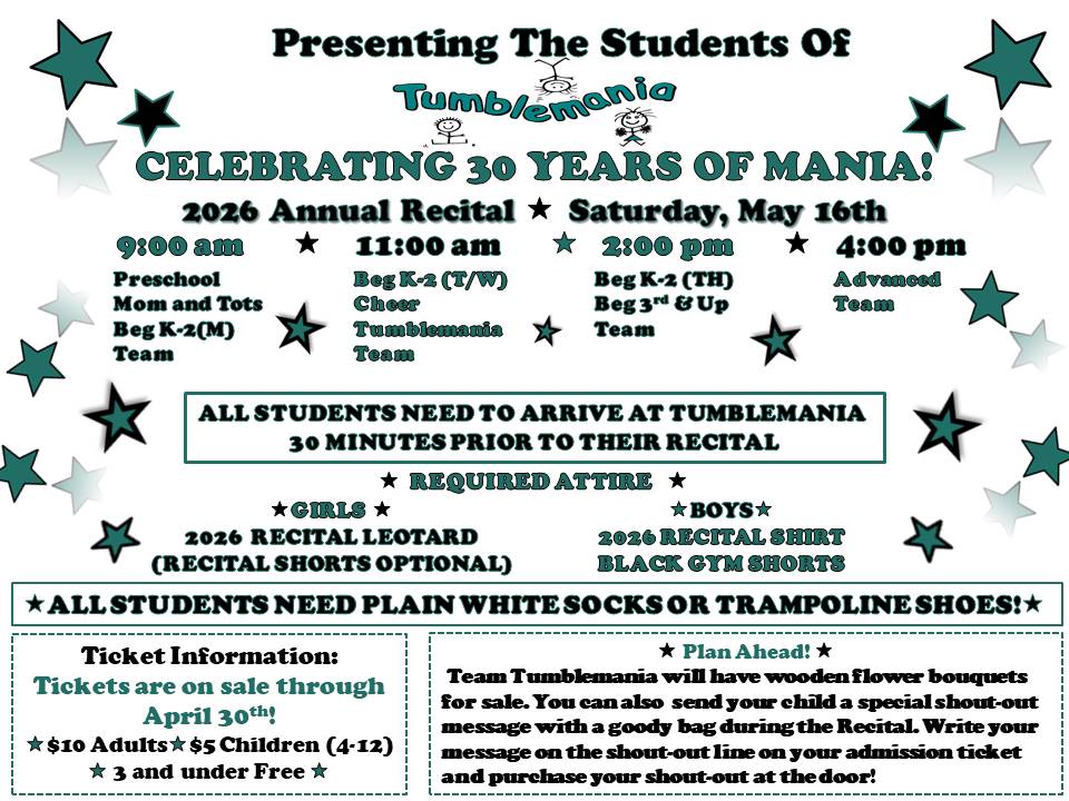 SAVE THE DATE! CELEBRATING 30 YEARS OF TUMBLEMANIA IN 2026!! TUMBLEMANIA’S ANNUAL RECITAL IS SATURDAY, MAY 16TH!!