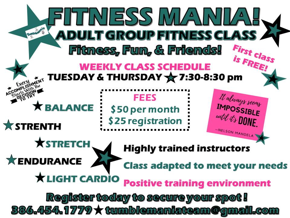 ADULTS WE NOW HAVE A CLASS FOR YOU! FUN AND FITNESS WITH FRIENDS!! REGISTER TODAY FOR FITNESS MANIA! OFFERED TUESDAY & THURSDAY EVENINGS!!